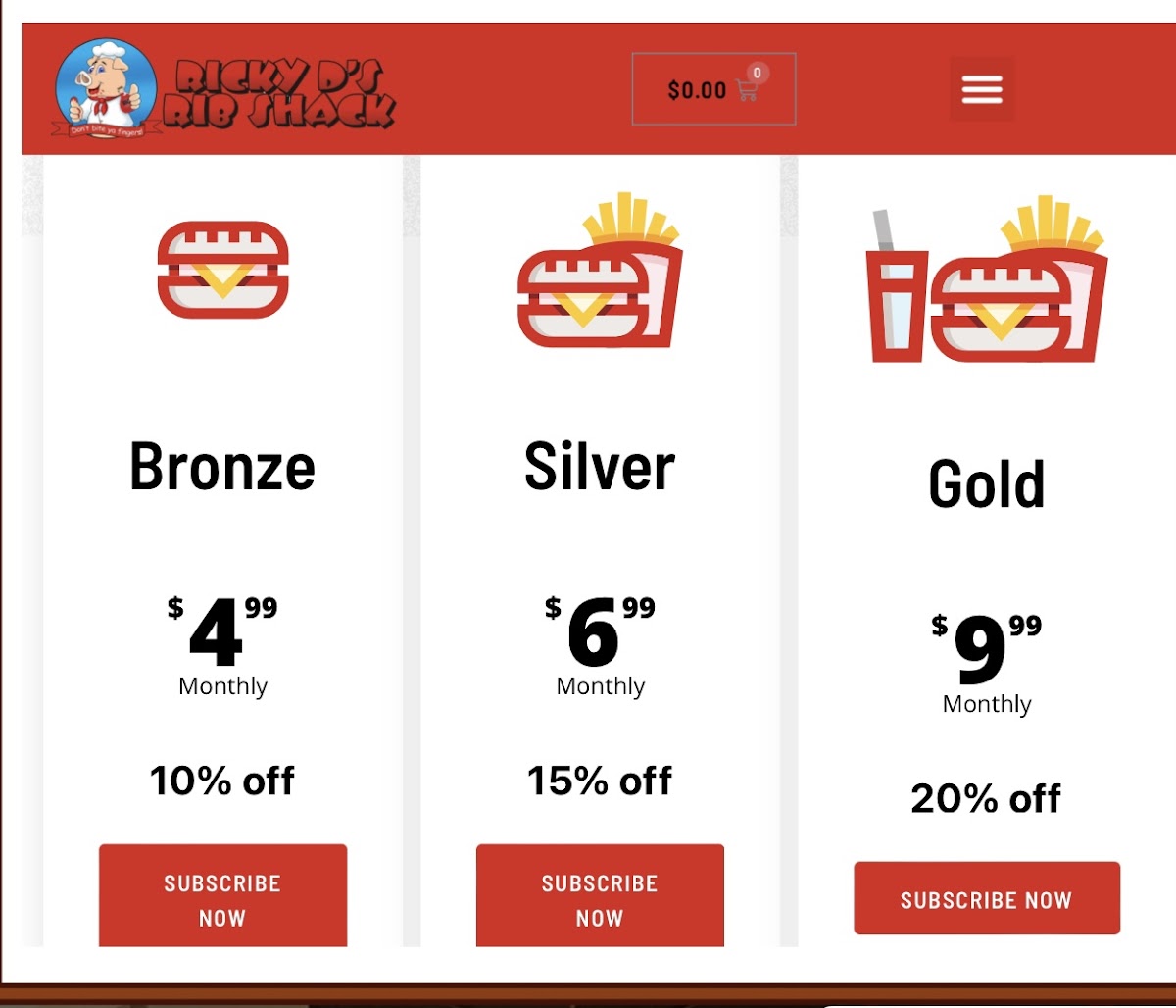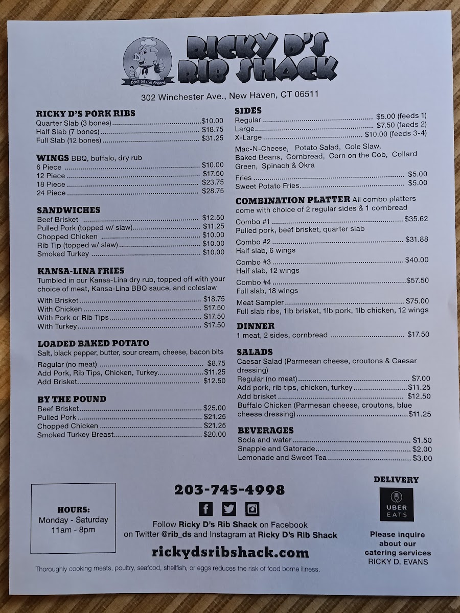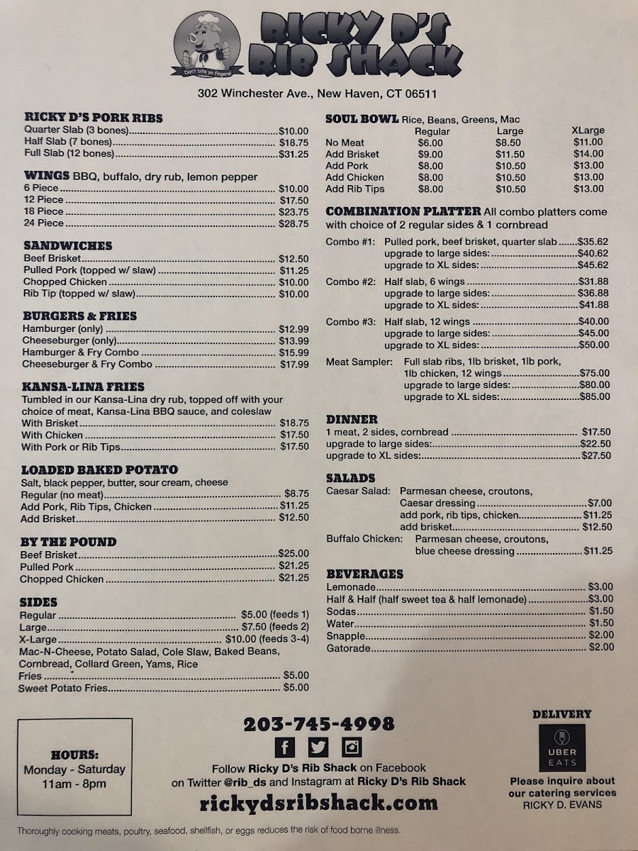 As a final takeaway, the menu at Ricky D’s Rib Shack offers a well-rounded and satisfying snapshot of classic American BBQ and soul food, with enough variety to appeal to both first-time visitors and returning regulars. The selection moves confidently from lighter options like Buffalo Chicken Salad and Caesar Salad to hearty mains such as Dinner (Regular), Dinner (Large), and Dinner (XL), making it easy to tailor a meal to your appetite. BBQ lovers will naturally gravitate toward the rib offerings, including Quarter Slab (3 Bones), Half Slab (7 Bones), and Full Slab (12 Bones), as well as the smoky meats sold By The Pound like Chopped Chicken, Pulled Pork, Beef Brisket, and Kielbasa. For those who enjoy variety, the Combination Platters-from Combo #1 (Regular) and Combo #1 (Large) to Combo #2 (Regular) and the Meat Sampler (Regular) or Meat Sampler (Large)-nicely showcase the kitchen’s strengths. Comfort food fans will appreciate sides such as Mac-N-Cheese, String Beans, Potato Salad, Rice, and Cornbread (1pc), along with larger tray options like Mac & Cheese (Full Tray) and Collard Greens (Full) for group dining. The menu also covers casual cravings with Cheeseburger Only, Hamburger Only, and combo options like Cheeseburger & Fries Combo or Hamburger & Fries Combo, while indulgent picks such as Kansa-Lina Fries, Loaded Baked Potato, and the Soul Bowl in Regular, Large, or XL Soul Bowl sizes round out the experience. Wings are available in flexible counts-6 Wings, 12 Wings, 18 Wings, or 24 Wings-and desserts like Red Velvet Cake (Slice), Danish & Coffee, Croissant & Coffee, and Muffin Only provide a sweet finish. With refreshing drinks like Gorilla Lemonade (Lemon), Gorilla Lemonade (Cherry), Gorilla Lemonade (Green Apple), Gorilla Lemonade (White Peach), and Water, plus extras ranging from BBQ Sauce Bottle to 10oz Dry Rub, the menu feels complete, generous, and true to its BBQ roots-an overall conclusion that Ricky D’s Rib Shack delivers comfort, flavor, and choice in one cohesive lineup.